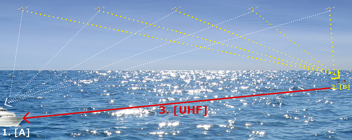 Aus der eigenen Position [A] und der GPS-Position [B] von den ENOS-Sendern, errechnet der Empfänger die exakte Entfernung und Richtung zu den abgetriebenen Tauchern.
